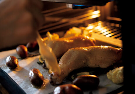 先生:はい。皮がおいしそうに焼けています。残りのオリーブオイルを鶏モモ肉の皮目に塗って、7〜8分焼いたら完成ですよ。