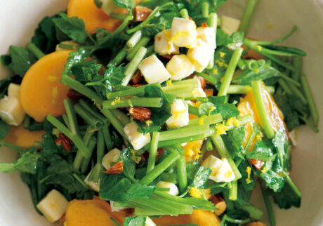 先生:そうそう。使い慣れれば何でもないの。オーブンで40分ほど焼くので、その間に「柿と芹のサラダ」を作りましょう。柿の皮をむいたら16等分に切ります。芹は3㎝長さに切りましょう。今日は柔らかい部分だけ使いたいので、根っこはお味噌汁の具などにしてね。さて、アーモンドはローストしてから粗めに刻み、チーズは1㎝角に切ります。チーズは、ほかの食材の邪魔をしない優しい味わいのものが合いますよ。今回はブリー・ド・モーという白カビのチーズを使いますが、カマンベールでもおいしくできます。