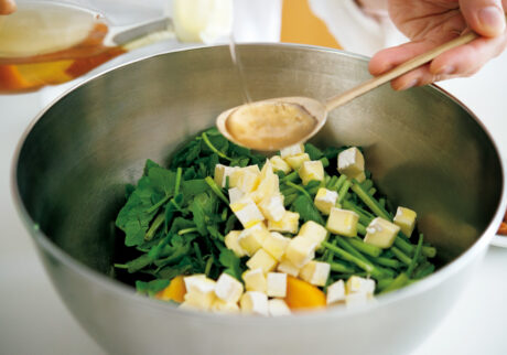 3.ボウルに1と2を入れ、オリーブオイルをまわしかけ、米酢、粗塩をふる。柚子の皮を削って散らす。