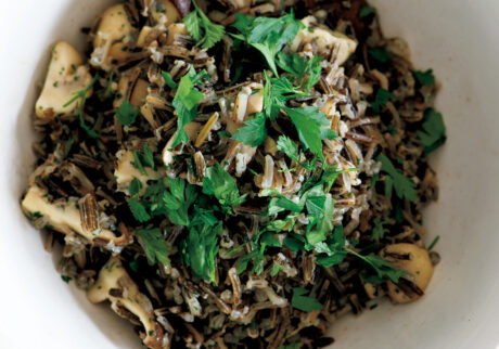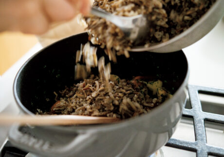 先生:ワイルドライスはざっと洗ってからお湯で20分茹でてザルにあげます。椎茸とマッシュルームは4等分に切り、ハーブは粗めに刻みましょう。鍋にオリーブオイルを熱したら、椎茸、マッシュルーム、ハーブの順に中火で炒めて、フタをして弱火で3分蒸し煮にします。ワイルドライスを加えてさらに炒め、粗塩、バターを加えたら出来上がりよ。