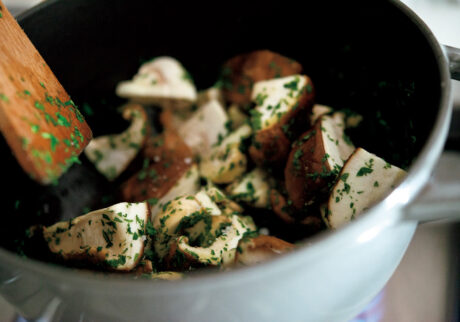 3.鍋にオリーブオイルを熱し、椎茸、マッシュルーム、チャービル、イタリアンパセリの順に中火で炒め、弱火にしてフタをして3分蒸し煮にする。