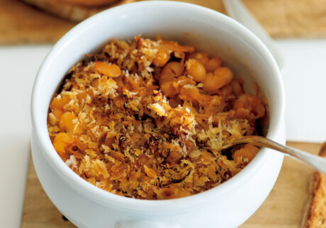 5.トマトペーストと白インゲン豆を入れて混ぜ、フタをしてさらに弱火で30分煮込む。耐熱容器に移し、パン粉を軽くふり、オリーブオイルをまわしかけて、200℃に温めたオーブンで5~10分ほど焼く。