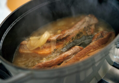 4.厚手の鍋に豚バラ肉を入れて、玉ネギ、ニンニク、タイム、ローリエ(1枚)を入れ、1の茹で汁(分量900㎖。足りなければ水を足す)を注ぎ、フタをして強火にかける。ひと煮立ちしたらアクを取り、白ワインを注ぐ。フタをして中火弱で1時間30分煮込む。タイム、ローリエを取り出し、軟らかくなった豚肉を木べらなどでほぐす。