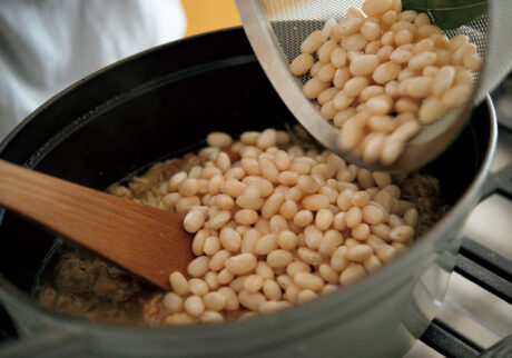 先生:さて、今月は煮込み料理をメインに、前菜やサラダを作っていきます。まずは「豚肉と豆の煮込みオーブン焼き」から。乾燥の白インゲン豆を使うので、前の晩に水に浸けて戻しておいてください。戻した豆を鍋に入れて水を注ぎ、ローリエを入れて火にかけ、沸騰したら弱火にして30分ほど茹でます。この茹で汁は、肉を煮込むときに使うので取っておいてね。