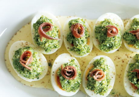 4.皿に2を敷き、ゆで卵を並べ、1とアンチョビをのせ、白胡椒を挽く。