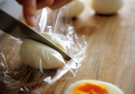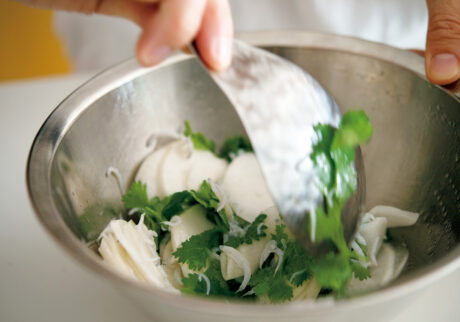 先生:ゆで卵はラップをかけた上から包丁を入れるときれいに切れますよ。さてもう一品、「カブとパクチーのサラダ」です。カブは、皮をむいたら薄い輪切りにして、ボウルに入れて塩をふってなじませます。そこにパクチーの葉とシラスを加えて、レモン汁、太白胡麻油をふって、ざっと和えたら完成です。