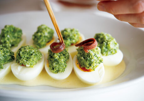 3.鍋に湯を沸かし、沸騰したところに卵を入れて7分40秒茹でる。熱いうちに殻をむき、縦半分に切る。アンチョビも縦半分に切る。