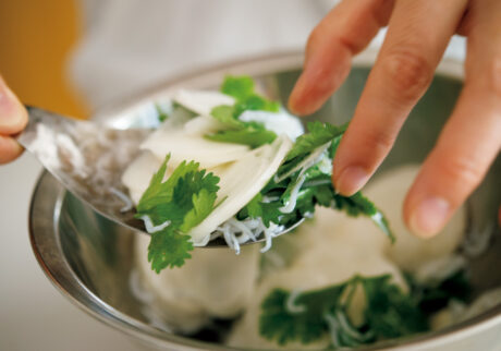 2.1のボウルにパクチーの葉、シラスを加え、レモン汁、太白胡麻油をふり、ざっと和える。