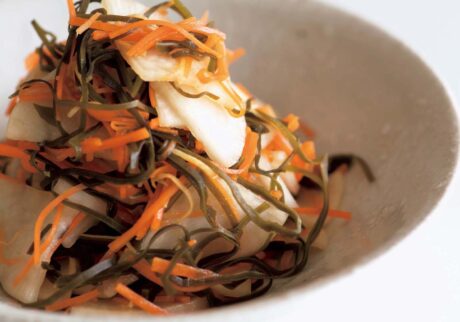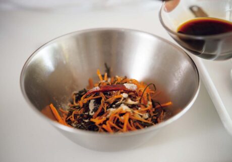 先生:続いて、ニンジン、ショウガを細切りにして、細切り昆布と合わせ塩をふりなじませます。しんなりしてきたら、種を取ったタカの爪、きび砂糖、醤油、酢を加えて、さらになじませましょう。最後に、ペーパーで水気を押さえた大根と合わせて全体を和えます。
