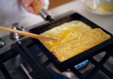 先生:溶いた卵液に、きび砂糖、酒、醤油、塩、カツオだしの順に加えて、よく混ぜます。卵焼き器を熱したら、米油を全体になじませて、キッチンペーパーで軽く拭きましょう。卵焼き器全体に卵液が広がるように流し、強めの中火で巻いていきます。焼けたら玉子焼きを奥へずらし、ペーパーで米油をなじませ、卵液を流して手前に巻きます。同じように残りも繰り返しましょう。