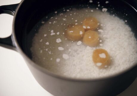 1.米は洗って、ザルにあげる。鍋に入れ、水、干し貝柱を入れて30分浸水させる。フタをして強火で10分、ふいてきたら鍋底からさっと混ぜ、フタをずらして弱火で25分炊く。