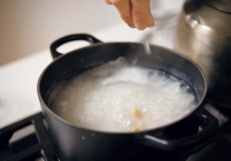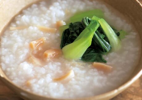 先生:最後は「干し貝柱のお粥」です。洗ってザルにあげておいた米を鍋に入れ、水、干し貝柱を入れて30分浸水させます。フタをして強火で10分、ふいてきたらさっと混ぜ、フタをずらして弱火で25分炊きます。青梗菜は縦3等分、長さ4等分に切り、別の鍋に水100㎖を沸かし、塩小さじ2分の1、太白胡麻油、青梗菜を加えてフタをして2分蒸し煮。お粥の鍋には塩を適量加えて味を調え、さらに2分ほど炊いて、青梗菜をのせたら完成よ。