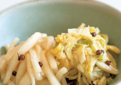 先生:ではまず「白菜の香り漬け」からいきましょう。白菜は葉と芯に分けて切り、それぞれボウルに入れ、塩を半量ずつふってなじませて、30分ほど置いたら水気をきりましょう。次に酢、きび砂糖、醤油を合わせたものをかけて再びなじませます。
