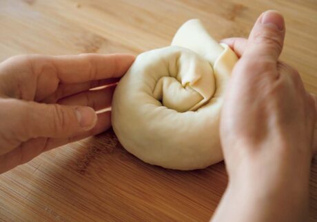 先生:ボウルに強力粉ときび砂糖を入れ、水を加えてひとつにまとめ、生地の入ったボウルにふわりとラップをかけ、冷蔵庫で休ませます。万能ネギは小口切り。麺棒と台に打ち粉をして、生地を麺棒で薄くのばしてラードを全体に塗ります。万能ネギ、シラス、白胡麻を散らして粗塩をふりましょう。生地は細く巻き、いったん筒状に。それを渦巻きにして、麺棒で押さえて薄くのばします。