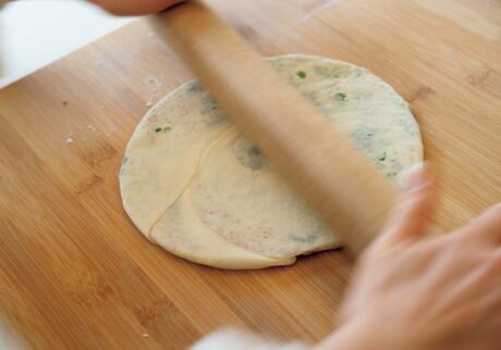先生:直子さん、麺棒は必ず両サイドを押さえて使ってね。生地がちぎれるので、端っこまでのばさないのがコツよ。フライパンは、生地がつかないようによく熱して。胡麻油をひいたら、生地をのせて強火で焼き目をつけて裏返し、フタをして弱火で6分30秒焼きましょう。フタを取って、さらに返して、パリッとなるように中火で2分焼きますよ。