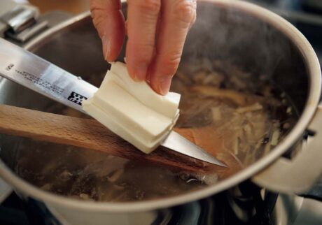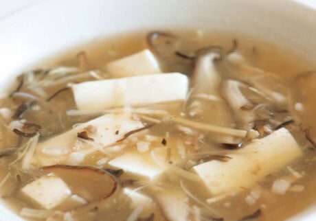先生:最後は「細切り野菜と豆腐のスープ」よ。干し椎茸とキクラゲはお湯で10分ほど戻します。干し椎茸は薄切り、絹豆腐は4等分にしてから薄切り、ほかの具は細切りに。鍋に胡麻油を熱したら、ショウガ、豚バラ肉、干し椎茸を中火強で炒め、長ネギ、筍、キクラゲも入れて炒めお湯を注ぎます。フツフツしてきたら、3〜4分煮て、酒、醤油、塩を加え、水溶き片栗粉でとろみをつけて、崩れやすい豆腐を最後に入れます。豆腐で味が薄まるので、塩で味を調えて仕上げてくださいね。
