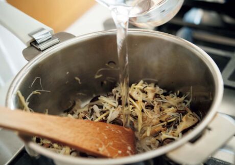 3.鍋に胡麻油を熱して、ショウガ、豚肉、干し椎茸を中火強で炒め、長ネギ、筍、キクラゲも加えてしんなりするまでよく炒め、湯を注ぐ。フツフツしてきたらそのまま3~4分煮て、酒、醤油、塩を加える。