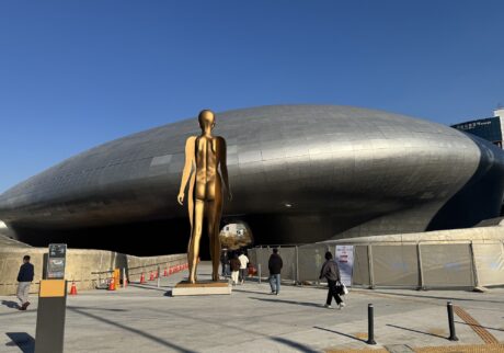 続いて、いくつかの書店を回って挨拶したのちに、ザハ・ハディドが設計した「東大門デザインプラザ(DDP)」にも少しだけ立ち寄り。以前ソウルを訪れた際は時間がなく、夜に外からちらりと見ただけだったのですが、昼間に見る流線形のフォルムが本当に美しい建築でした。僕が訪れたときは、「ジャン・ミシェル・バスキア:過去と未来をつなぐ象徴的記号たち」が開催中で、ここでもお土産をゲット。こちらも1月31日まで開催中。まだ間に合いますよ。