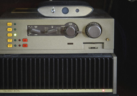 このラックに、スピーカーは〈ロジャース〉の「LS3/5A」、アンプは〈クオード〉の44と405、レコードプレイヤーは〈テクニクス〉の「SL-1200MK5」を置いています。