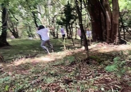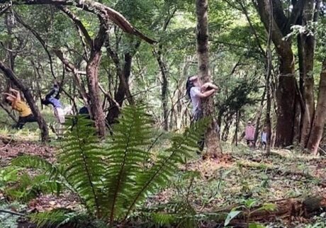 翌朝⽬が覚めると、全⾝が⾒事な筋⾁痛!朝⾷をとり、ウォームアップのクラスを経て、いよいよ森へ。