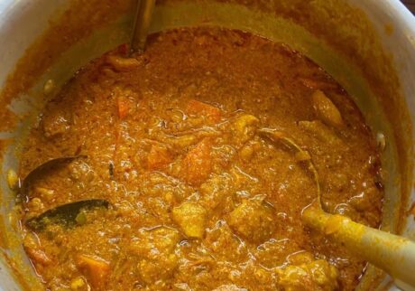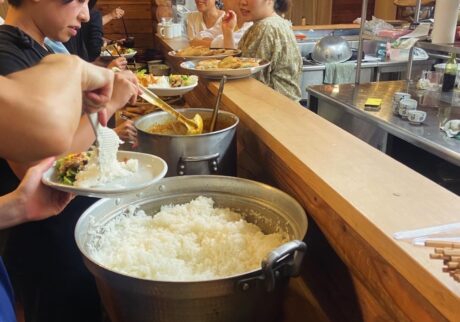 ⼣⾷のカレーは⼿を使い、触覚でも味わってみた。