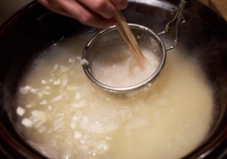 私が営む『KOMB』では、日頃からお世話になっている酒蔵から酒粕を取り寄せ、料理に使っている。今回選んだのは、「手取川」をはじめ、澄んだ味わいの日本酒を造る石川県にある吉田蔵の酒粕だ。酒蔵ごとに酒の個性が異なるように、酒粕もまた、風味やコクにそれぞれ違いがある。