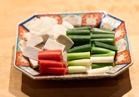 3.猪しゃぶ肉は皿に盛る。九条ねぎは4cmほどに切り、同じく皿に盛る。大根は3cmほどの厚めの銀杏切りにし、人参は4cmほどに切って串切りにする。海老芋があれば、一口大に切る。大根と人参は、それぞれさっと茹でてザルにあげる。海老芋は、串がすっと通るまで蒸す。蒸し終えたら、ラップはせず、そのまま冷ます。