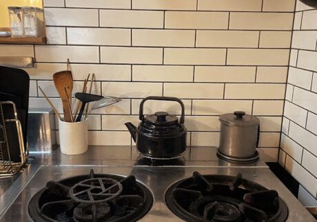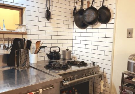 こうして導入された業務用のステンレス製シンクは、蓄積した汚れを、たまにの掃除で乱暴に擦っても耐えてくれるし、何度でもピカピカに復活してくれる。そして、これまた業務用の大きなガスコンロも同様だ。