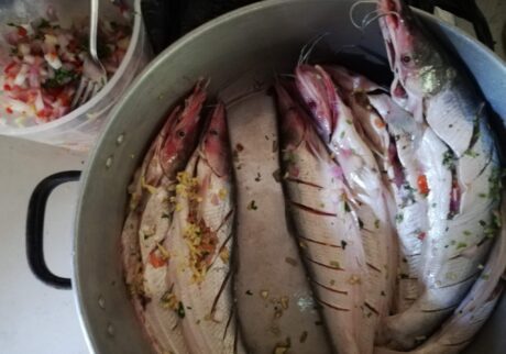 内臓を取り除き、ニンニクと玉ねぎを刻み、レモン、塩、辛くない唐辛子を混ぜたもの(これらを一部とっておく)をお腹に詰めて、バナナの葉でクルクル巻いて炭火焼きにします。そして焼きあがった魚に、残りの具を生のままトッピング。