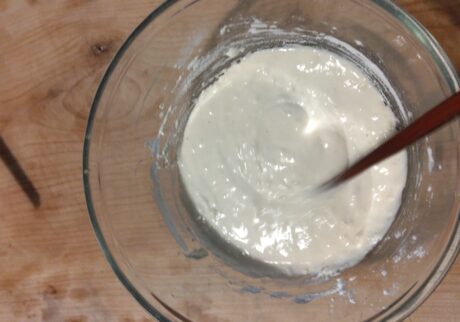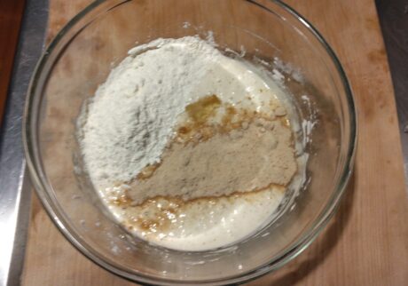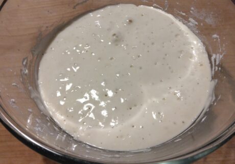 ボウルに薄力粉、ドライイースト、水を入れて天ぷらの衣くらいの硬さのドロドロした生地を作ります。ドライイーストの分量はどのくらいでも大丈夫。もし家に酒粕があれば、ドライイーストの代わりに酒粕でもOKですし(発酵まで時間がかかります)、酵母液のようなものを持っていれば、その液体に小麦粉を入れれば大丈夫です。