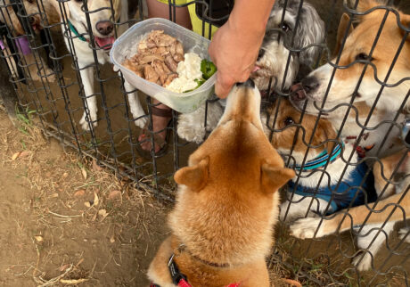 こんにちは、ハルくんです。お友だちの台湾犬グーフィーのママから聞いたのですが、どうやらいつもの公園のドッグランでは、毎朝おやつパーティが開催されているとか。ぼくのお散歩は外周コースなのですが、原っぱ広場を横切っているときに「ハルちゃ〜ん」というグーママの呼ぶ声が聞こえたので、ラン方面に行ってみました。するとどうでしょう! 素晴らしいおやつ弁当が振る舞われていたのです。というわけで、この日はぼくも柵の外側からおやつパーティに参加させてもらいました。おいしかった〜。