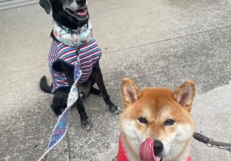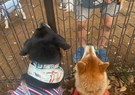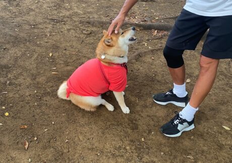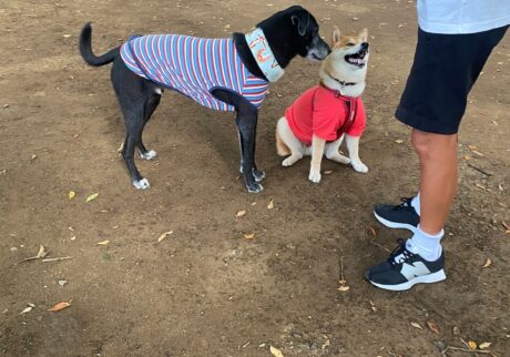 こんにちは、ハルくんです。順調にドッグラン生活を楽しんでいるぼくです。ただ、お洋服に関しては不満があります。やはりかーちゃんのTシャツでは無理がある、と抗議したら、アマゾンで見つけたヤツをポチってくれたのですが、これまたサイズ感がおかしい。柴犬標準だとXLくらいを推奨されていたのですが、かーちゃんが採寸してくれたぼくのサイズだと3XLじゃないと入らないらしい。それってサモエド標準だよ、かーちゃん。でも首とお腹まわりはどうやらピッタリ。着丈がだいぶ長いので、またしても余った分を縛って着てみました。お友だちの台湾犬グーフィーは、オーダーメイドの素敵なやつを着ていてうらやましかったです。