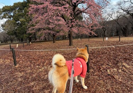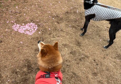 こんにちは、ハルくんです。みんなが楽しみにしている桜も、あっという間に散ってしまいましたね。ぼくたちの公園にも桜の広場があって、例年すごい人出になります。で、この写真はソメイヨシノが咲くだいぶ前、早咲きの桜でお花見をしたときの様子です。グーフィーとお花を堪能していたら、誰かが作った花びらのハートを見つけました。なんだかいいことがありそうじゃないですか?