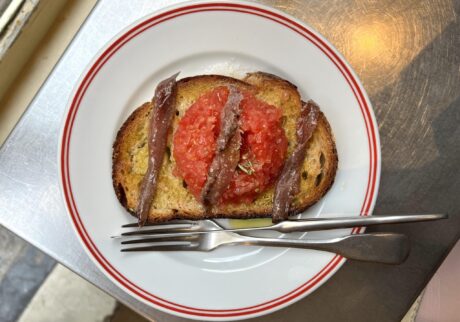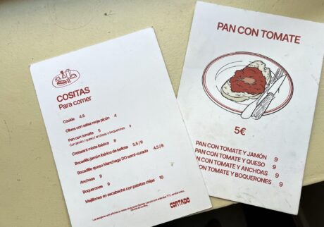 それでもまずはタルティーヌ!と列に並んだ。自分の順番がきて、カウンターに置かれたメニューに視線を落とすと、2種類ある。うち1枚は「パン・コン・トマテ」(スペイン語で「パンとトマト」を意味する、トマトをのせたカタルーニャ料理)の見出しがおどり、真ん中に大きなイラストが描かれ、その下にはスペイン語でさらに4種類のパン・コン・トマテが書かれていた。「そうか、ここはスペインのコーヒーショップなのか!」と理解して、アンチョビのせを頼んだ。