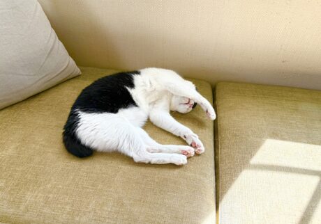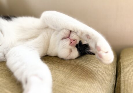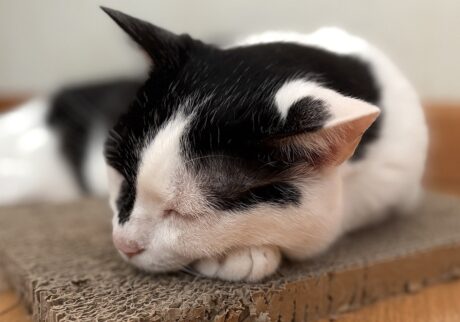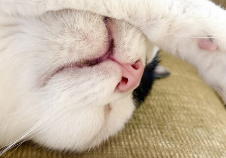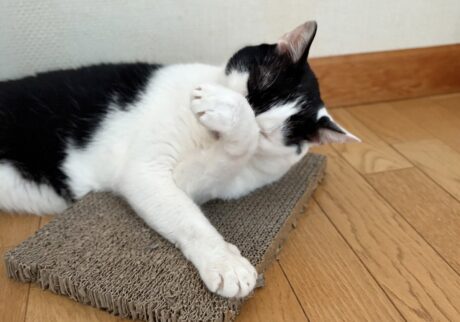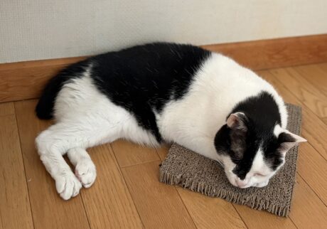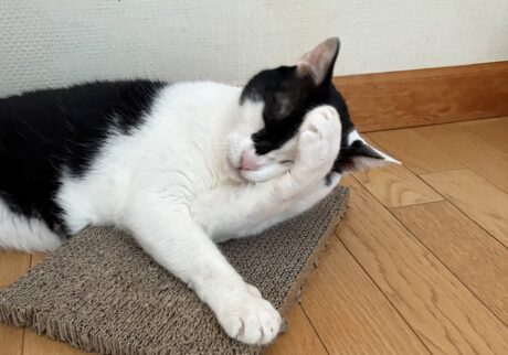 気圧が下がると、人間もだるくなるけれど、えいたもどうやら同じ。ただでさえよく寝ているのに、さらに寝る。晴れた日は、光を浴びるように前足を万歳してのびやかに寝ているけれど、雨の日は、爪とぎダンボールの上にぺたりと張りついて、湿気に撫でられているような寝姿だ。見ているこちらまで、つい、けだるくまぶたが重くなる。