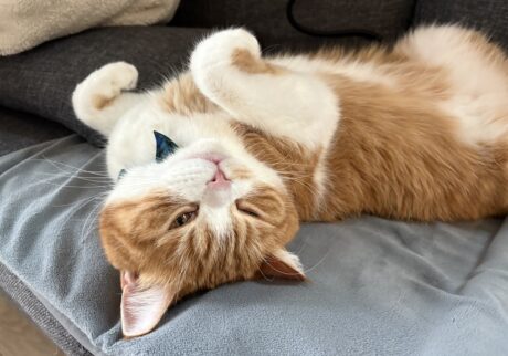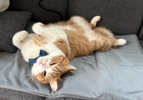 僕の名前はとろろ。2025年3月で5歳になった、ふわふわほっぺのハチワレの男の子。僕の真っ白でふわさらな胸毛を見た飼い主さんが「摺ったとろろ芋みたいだね」と、とろろという名前を付けてくれたよ。この自慢の胸毛のおかげで、香箱座りがきれいだって褒められるんだ! 性格は甘えん坊で、毎晩ゴロゴロ喉を鳴らしてふみふみするのが日課だよ。本誌2023年4月号にて、わたなべとしふみさんによるとろろの紹介イラストを掲載しています。